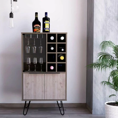 General description This wine cabinet features ample bottle storage alongside a glass door enclosed space for glassware, including a wine glass hanging unit. The stylish design includes a double door cupboard for additional storage, making it perfect for organizing your favorite bottles and glassware. Made in a smoked oak effect with a contrasting bleached grey oak finish, it is complemented by black pull handles and hairpin shape legs. Technical specifications Dimensions: Width 60 cm, Depth 40 cm, Height 109 cm Usage Store your favorite bottles of wine. Keep wine glasses safe and clean in the glass door cupboard. Utilize the double cupboard at the bottom for additional bottles and drinks coasters.