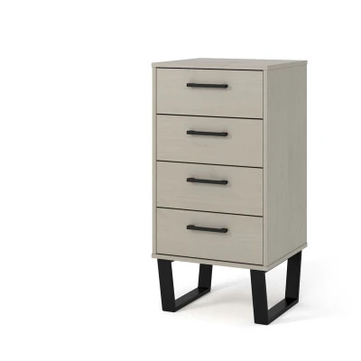General description The Vigo Grey bedroom range combines real wood with a rich grey wax and metal to create a casual industrial styled look for your home. The simple lines and black stove painted metal legs complement the cabinets, which feature a grey washed wax finish that highlights the natural grain and characteristics of the wood. This 4 drawer narrow chest, with equal sized drawers, is ideal for storing socks, underwear, folded clothes, towels, or bedding. It is suitable for any area in your home where you need additional storage in a compact design. Technical specifications Width: 45 cm Depth: 39.5 cm Height: 90.3 cm