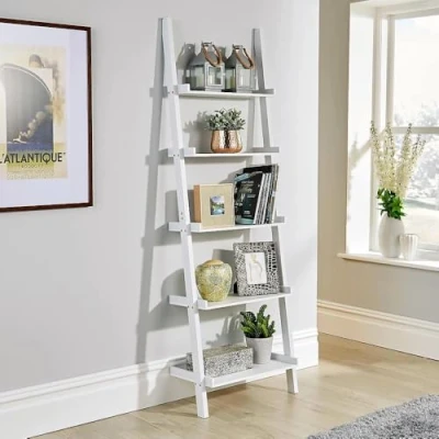 Home Source Ladder Bookcase Shelving Unit Display Ornament Stand Shelf Wall Rack Storage, White, 5 Tier