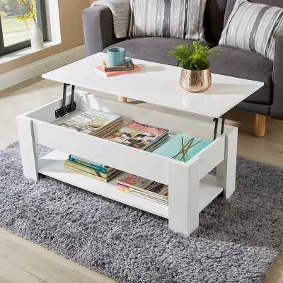 CONTEMPORARY LIVING: Perfect for modern living, this stylish table is more than just a convenient area to place your favourite beverage. The table top lifts up, slides over and locks in position, so it does not need holding open. It opens up to reveal hidden storage inside that is perfect for tidying away books, puzzles, and magazines, plus games and jigsaws and your precious remote controls. HIGH QUALITY MATERIALS: The sturdy, rectangular frame is expertly crafted from high quality materials to ensure the table is robust and fully supported. With its generous proportions and clean lines, you will feel confident that this superior product is good value for money and will withstand the test of time. AMPLE STORAGE: As well as being a central piece in your living space, this modern occasional table offers a wealth of ample storage space. With a spacious hidden compartment. There is also an open shelf at the base of the table which is perfect for keeping books, newspapers and other handy items. DIMENSIONS: Width 100cm, Depth 50cm, Height 38cm (51cm when fully lifted). This table adds a modern flair to any interior. EASY ASSEMBLY: Arrives flat packed with clear instructions for home assembly.