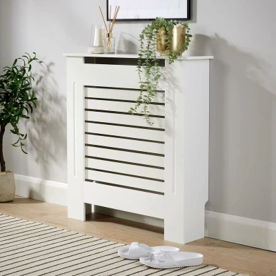 Home Source Radiator Cover Wooden MDF Wall Cabinet Shelf Slatted Grill Modern, White, Small