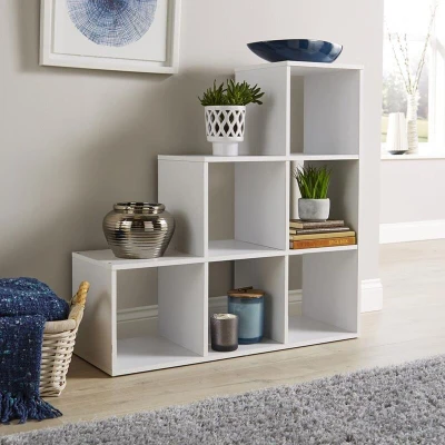 General description Part of our Cube Collection, the 6 Cube Step Storage Unit offers a unique design with a crisp, classic white finish. It features three cube spaces at the bottom, two in the middle, and one at the top, making it versatile for various storage needs. This unit is perfect for use in multiple rooms, such as the bathroom for toiletries and towels, the bedroom for bedding and clothes, the home office for files and documents, the hallway for shoes and boots, or the lounge for books and ornaments. Its open design allows access from both sides, making it an excellent choice for under stairs or as a room divider. Technical specifications Unit size: (H) 90cm (W) 90cm (D) 30cm Optional Canvas Drawers Size: (H) 27cm (W) 27cm (D) 27cm Usage Consider using handy slot-in canvas boxes to store a variety of items, including toys, clothes, shoes, and personal accessories. The unit can be rotated to change the orientation of the step design, allowing for customization in your space.
