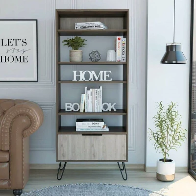 General description This display bookcase features an abundance of shelving space along with a handy enclosed storage area behind a drop-down door. Made in a smoked oak effect with a contrasting bleached grey oak finish, it includes black pull handles and hairpin shape legs. The Melrose tall display bookcase is versatile, offering great storage options with shelves of various heights to accommodate books and personal collections. The drop-down door at the bottom provides additional storage for items you prefer to keep out of sight. Its height also allows it to be used as a room divider, creating distinct spaces in your home. Technical specifications Width: 72 cm Depth: 38 cm Height: 171 cm