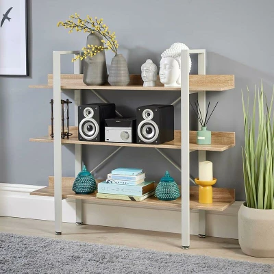 General description Ideal for any living space, this Urban Style 3 Tier Wide Bookcase Display Rack in Oak Finish with a Grey Frame is a stylish way to showcase your ornaments. Expertly crafted from Sonoma oak, this modern piece features three separate shelving planks, providing ample space for your decorative items. The strong grey metal frame adds an industrial touch to the overall design. Technical specifications Dimensions: (W) 120cm (D) 28cm (H) 106cm Material: Sonoma oak and grey metal frame