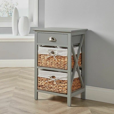 Home Source Wooden Chest of Bedside Storage Unit with Water Hyacinth Basket Organiser, Engineered Wood, Grey, 2 Drawer