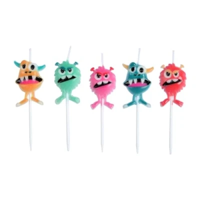 Includes: Set of 5 3D Monster Candles+Plastic Monsters Pick Candle Set: Complete the decoration of your birthday cake with this festive candle set VARIETY OF COLORS AND STYLES - Choose from a range of bright colors and fun shapes to match your party theme Easy to use: these candles light up easily and stay stable on the cake for ideal presentation ADD A FINISHING TOUCH - Create a festive mood by adding these candles to your dessert, for a memorable celebration