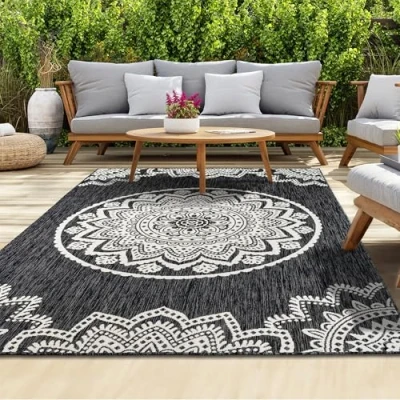 homeart Outdoor Rug Easy Clean, Durable, Stain Resistant, Weather & UV Resistant Indoor Rugs for Porch, Deck, Balcony, Garden, Picnic and Patio Mandala Black, Cream 160x230cm