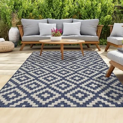 homeart Outdoor Rugs Easy Cleaning Indoor & Area for Porch, Deck, Balcony, Garden, Picnic, Kitchen, Hallway UV Weather Resistant Large Patio Rug Mats D.Blue Cream, 140 x 200 cm