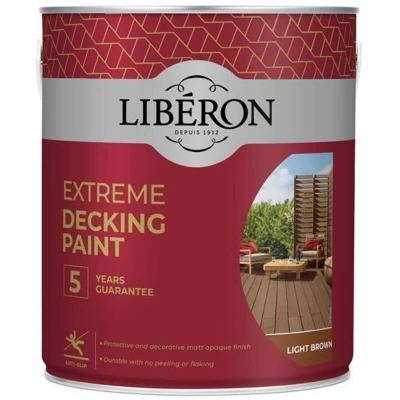General description Liberon Extreme Decking Paint in Light Brown is specifically designed for exterior wooden decking, suitable for soft, hard, exotic, smooth, or grooved surfaces. This paint provides a protective and decorative matt opaque finish that is both durable and aesthetically pleasing. It is anti-slip, highly water-repellent, and resistant to foot traffic, impact, UV rays, stains, weathering, and everyday dirt. The paint is easy to apply directly on all surfaces without the need for cleaning, undercoating, or wiping, making it an ideal solution for enhancing and renovating your exterior wood. Technical specifications Volume: 2.5 litres Coverage: 25m² per 2.5 litres Dry Time: 24 hours Application Application Method: Brush or Roller Tool Cleaning: Water Other information 5-year guarantee Finish: Decorative matt opaque Durability: Won't peel or flake