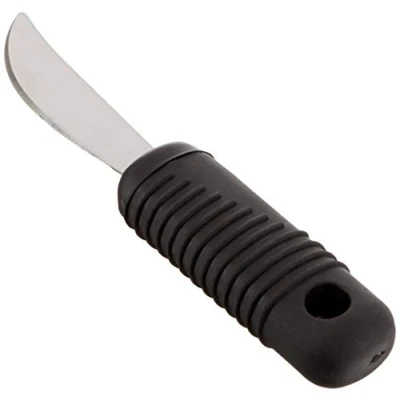 Easily bendable metal rocker knife with a 4" long, thick rubber handle, measures 8" in total length Comfortable 1-1/2" wide built- up ribbed rubber handle provide a soft firm handle to improve grip and maintain it while eating a meal Bendable stainless steel design allows these assistive tools to be bent at different angles to make eating easier for those with limited range of motion Can be bent to the right or left to accommodate reduced range of motion and provide the greatest comfort for the user Stainless steel silverware is dishwasher safe up to 125 degrees and is latex free