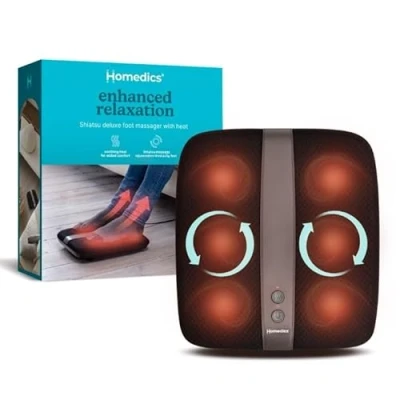 DEEP KNEADING FOOT MASSAGER: The HoMedics Shiatsu Deluxe Foot Massager uses 28 rotating nodes per foot, delivering targeted relief to aching arches and sore soles through professional-style shiatsu massage techniques that create the feel of a real massage SOOTHING HEAT THERAPY: The electric foot massager's soothing heat feature enhances relaxation, helping to ease tightness, tension and sore muscles by providing deeper relief for overworked feet after long days of standing or walking EFFORTLESS OPERATION: Convenient toe-touch controls offer complete hands-free operation of your heated foot massager, making it suitable for everyone to enjoy. With whisper-quiet running you can enjoy your relaxing massage session without interruption SLIM & STYLISH DESIGN: The ultra-slim design of this Shiatsu foot massager allows for simple storage when not in use, tucking easily under furniture or in cupboards. Its stylish, modern profile fits seamlessly into any interior without intruding on space UNIVERSAL COMFORT: This electric foot massager's generous size accommodates feet up to UK Size 12/EU Size 47. The ergonomic massager design ensures optimal node placement for maximum relief across most foot sizes and shapes THE HOME OF WELLNESS: HoMedics has grown into a world leader in personal wellness products. Our brand is about creating a healthy home environment that helps you relax your body, de-stress, and simplify your life