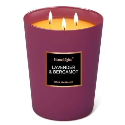 HomeLights Highly Scented Soy Candles Big 33.3 oz for Home. 3 Cotton Wicks, Smokeless Long Lasting 130 hrs in Lavender & Bergamot. 5x6, Great Gift Women Men