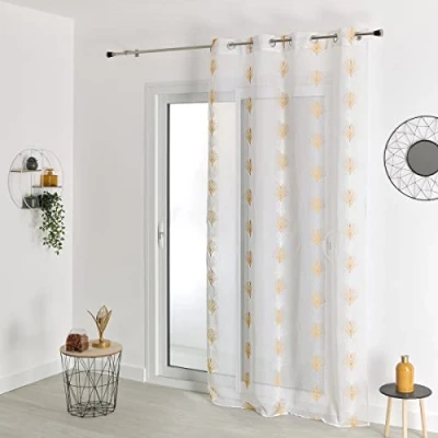 HomeMaison.com Linen Effect Embroidered Net Curtain Mustard 140 x 240 cm Silver Eyelet Modern Window