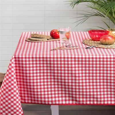 Rectangular tablecloth perfect for bringing a country feel to your kitchen or dining room. With its red and white gingham pattern, it is designed to comfortably accommodate 8-10 diners Stain and wrinkle resistant certification for worry-free use. This high quality polyester tablecloth effectively resists stains and wrinkles, ensuring a long service life Easy installation on most rectangular tables thanks to its generous size of 145 x 240 cm. Polyester provides soft texture and elegant fall, suitable for any occasion Easy to clean, this tablecloth can be wiped clean with a simple sponge. For a more thorough care, it is machine washable at low temperature and does not require ironing Satisfaction guaranteed with a red bias finish for a refined look. Sold individually, it is carefully packaged to ensure a reception in perfect condition