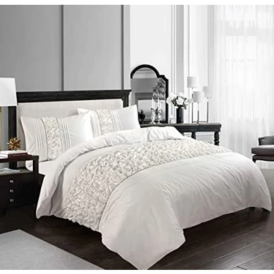 HOMES LINEN Luxury Bedding Ruffled Diamond Lace Sequence Aurora Easy Care Polycotton Duvet Cover Set (White, Single)