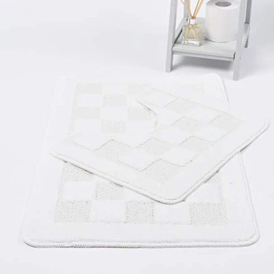 HOMES LINEN Squares 2 Piece Bath Mat & Pedestal Set Non Slip Extra Absorbent Square Bathroom Toilet Rug Mats (White)