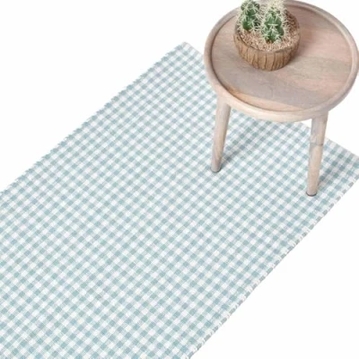 CHIC AND STYLISH: Eco-friendly artisan rug with a checkered pattern. Made entirely out of 100% recycled cotton yarns. Pack includes 1 light blue gingham rug measuring at 66 x 200 cm. EXPERTLY HANDMADE: Hand woven with love by skilled artisans using traditional handlooms in @@@HH2mpXfmIf/ISdLPemU9HcQK5oOg+1Kp@@@. Guaranteed quality finish with great attention to detail. VERSATILE ACCESSORY: This classic woven gingham rug is suitable for any room in your living space. You can style this in your bedrooms, living room, children's room, kitchen or dining room. Its simple yet attractive patterns can be effortlessly paired with your furniture of any style. Our gingham rugs are also available in 4 different sizes. EASY TO CARE AND MAINTAIN: Homescapes rugs can be vacuumed, brushed, and shook regularly to keep dust at bay. If stains do occur, it is recommend that you spot cleaning only. A BRITISH COMPANY: With more than 24 years of expertise, Homescapes has offered uniquely affordable luxury and is a leading manufacturer of home decor across Britain and Europe. Our products are crafted for a sustainable lifestyle. Discover our exclusive collection of home and garden essentials which includes hotel-quality bedding, bedroom and bathroom accessories, luxurious cushions, premium rugs, and more.