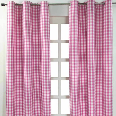 ManoManoGeneral description These HOMESCAPES Cotton Pink Block Check Gingham Eyelet Curtains are crafted from 100% yarn dyed cotton woven fabric, offering a rich appearance that surpasses printed curtains. Made in a contemporary ring top or eyelet style, they are suitable for all rooms, including children's rooms. The curtains are unlined, and for light-proofing, they should be used with a blackout curtain. Technical specifications Brand: Homescapes Size: Width 137 cm (54") x Drop 182 cm (72") Colour: Pink Material: 100% yarn dyed cotton woven fabric Care Instructions Dry clean only Cool iron on reverse Other information Pack includes one pair of curtains Coordinating cushions, floor cushions, and fabric by the meter are available for creating custom soft furnishings