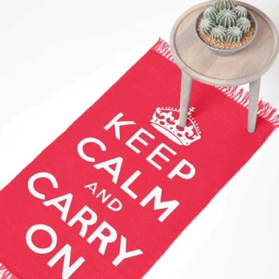 HOMESCAPES 100% Cotton Printed Rug Keep Calm and Carry On Red White 60 x 100 cm Hand Woven Base.
