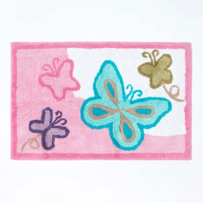 50 x 85 cm 100% cotton easy care Pink Butterfly tufted mat. Colour mat designed to ornate your children's room or bring in lot of colour and life to your bath room. Washable at home in your domestic washing machine makes it perfect for kid's room. Hand made in India by Homescapes with care. Part of proceeds from the sales of this rug directly affects the craftsmen and their families. Homescapes are well known for their quality products and this product compliments the huge selection of exclusive Homescapes range.