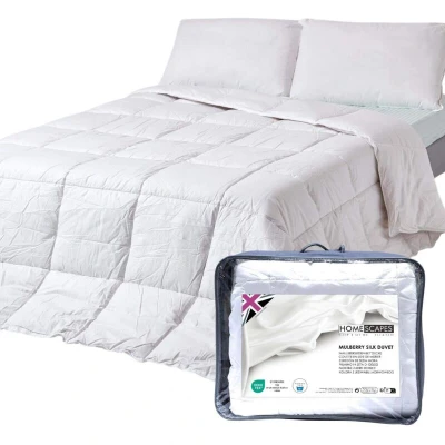 ManoManoGeneral description Pure Mulberry Silk Blend Duvet by Homescapes offers a luxurious and comfortable sleeping experience. This 4.5 Tog duvet is designed for the warmer months, providing lightweight and breathable comfort while effectively regulating body heat. The duvet is filled with a blend of pure Mulberry silk, known for its hypoallergenic properties, making it an excellent choice for allergy sufferers. Technical specifications Brand: Homescapes Size: King Size - 230cm x 220cm (90" x 87") Cover Material: 100% Cotton Filling: 100% Mulberry Silk Blend Tog Rating: 4.5 Care Instructions: Machine washable - tumble dry with care Usage Ideal for hot summer and spring months Regulates body heat to keep you cool Hypoallergenic, suitable for allergy sufferers Other information Combine with the Homescapes mulberry silk blend mattress topper for enhanced comfort