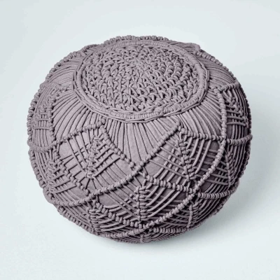 HOMESCAPES 40 cm Tall Grey Macrame Knitted Pouffe Been Filled Crochet Round Footstool 100% Cotton Braided Design x 50