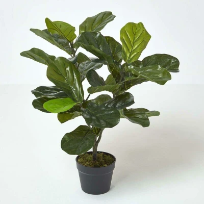 General description Give your home interiors a contemporary look with the HOMESCAPES Artificial Fiddle Leaf Fig Tree. Measuring 70 cm tall, this no-fuss faux tree is perfect for enhancing the aesthetic of your living room, bedroom, or hallway. Carefully handcrafted by skilled experts, it looks and feels realistic, making it a true botanical replica. The tree features wood effect trunks for an authentic appearance and faux moss at the base, adding to its lifelike quality. Technical specifications Brand: Homescapes Plant Height: 70 cm Pot Dimensions: H 15 cm x W 16 cm Pot Base: 12 cm Colour: Green Material: Plastic Other information Care Instructions: Wipe clean with a soft cloth The dark green leaves are UV protected to prevent colour fade No need for constant watering Arrives inside a black pot that can be placed inside your own planter for a stylish finish Also available in a larger size