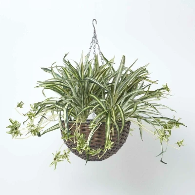 HOMESCAPES Artificial Hanging Basket 60 cm Long Faux Spider Plant In Replica Wicker Pot with Silver Metal Chain and Hook for Indoor Outdoor Decoration