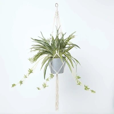 HOMESCAPES Artificial Hanging Basket 95 cm Long Faux Spider Plant In Grey Melamine Pot with Macramé Knotted Rope Style Hanger and Hook for Indoor Decoration