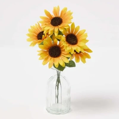 VIBRANT YELLOW SUNFLOWERS: Realistic sunflower bush measures 30cm x 17cm. Pack includes 5 stems of vibrant, artificial yellow sunflower stems. VERSATILE ARRANGEMENT: The artificial sunflower bunch can be displayed individually or combined with other Homescapes stems. Mix and match to create a lovely bouquet or a floral arrangement for your home, office, and other living spaces. Ideal as a floral home decor. PREMIUM HANDMADE QUALITY: Carefully handcrafted by skilled experts, Homescapes’ artificial plants look and feel just as good as real flowers and plants. These artificial flower stems are made from durable silk-like polyester material. The vibrant yellow sunflower petals look as fresh as the day they were crafted. EASY TO CARE FOR: Easy to maintain, simply wipe away dust or dirt with a soft cloth and keep out of direct sunlight. A BRITISH COMPANY: With more than 24 years of expertise, Homescapes is a leading manufacturer of artificial plants, trees and flowers in the UK and Europe. Choose from a wide selection of flowers and plants to add floral decoration to your home and office.