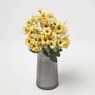 General description This HOMESCAPES Artificial Wild Daisy Yellow Bouquet Flower, measuring 46 cm, is composed of wild daisies that add a rustic and countryside touch to your interior decoration. Perfect for placing in a vase or incorporating into a floral arrangement, this artificial bouquet creates a romantic ambiance and is ideal for gifts or special occasions such as weddings and baptisms. Technical specifications Brand: Homescapes Size: 46 cm Material: Polyester, Wire, Plastic Care Instructions: Wipe with a soft, slightly damp cloth Other information Vase not included This artificial bouquet requires no special maintenance and has a long lifespan, making it ideal for those who dislike seeing flowers wilt. Homescapes offers a wide selection of high-quality and highly realistic artificial plants and flowers.