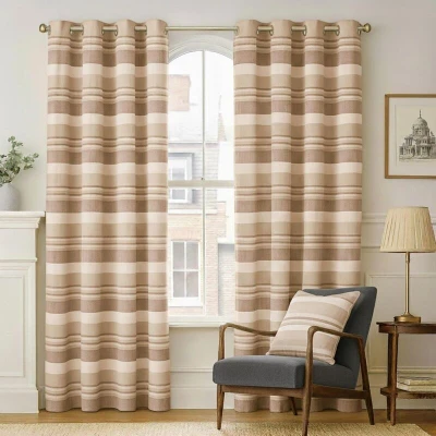 HOMESCAPES Beige Eyelet Curtain Pair 137cm (54") Wide x Drop Morocco Stripe Design Ring Top