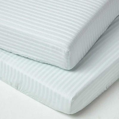 General description Homescapes Blue Cotton Stripe Fitted Cot Sheets are crafted from 100% cotton with a luxurious 330 thread count, ensuring a soft and comfortable sleeping experience for your child. This pack includes two sheets designed to fit cots measuring 60 x 120 cm with a depth of 15 cm. The sheets are not only super soft and durable but also anti-dust mite and naturally hypoallergenic, making them ideal for sensitive skin. Technical specifications Brand: Homescapes Size: Cot (60 x 120 cm, 15 cm Deep) Colour: Blue Material: 100% Cotton Thread Count: 330 Pack Includes: Two Sheets Usage Machine washable for easy care. Designed to wick away sweat, keeping your child comfortable throughout the night. Other information Fitted sheets are fully elasticated (not just in the corners) for a secure fit. Developed in 2008, this range is one of the most popular offerings from Homescapes, available in six colours.