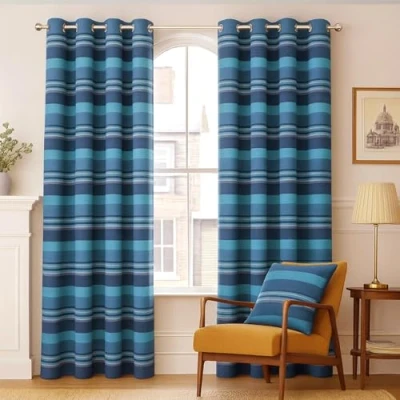HOMESCAPES Blue Eyelet Curtain Pair 167cm (66") Wide x 182cm (72") Drop Morocco Stripe Design Ring Top
