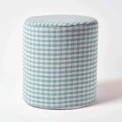 AmazonSturdy pouffe with a strong & compressed polystyrene foam filling and soft foam top. Classic gingham cotton fabric in blue. Handcrafted from pure natural cotton. Rounded, cylindrical shape Use as a footstool, pouffe or side table Round Shape, Measures 40 x 40 x 42 cm