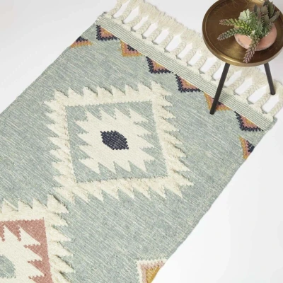 ManoManoSpecifications : Brand : Homescapes Colour : Blue and White Size : 66 x 200 cm, 90 x 150 cm, 120 x 170 cm, 160 x 230 cm Material : 25% Cotton, 75% Wool Care Instructions : Spot Clean Only Pastel blue geometric style kilim rug, handcrafted from cotton and wool, this traditional style rug features a modern design and is finished with decorative tassels. Kilim Rugs Woven from cotton and wool, this colourful and stylish rug is ideal for brightening up your home. It combines a boho style with a modern colour scheme while being super durable and ideal for heavy footfall areas. Completed with braided tassels, this kilim rug will add a decorative touch to your home. The Tenali rug is available in four sizes: 66 x 200cm, 90 x 150cm, 120 x 170cm and 160 x 230cm. Handwoven Rugs Add an eye-catching rug with a colourful diamond pattern and frayed tassels. This charming kilim rug has been expertly crafted from blue and pastel pink cotton and wool and will complement a variety of interior styles.