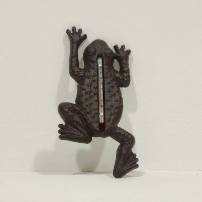 HOMESCAPES Brown Cast Iron Garden Thermometer Wall Mounted Frog Shaped Temperature Gauge