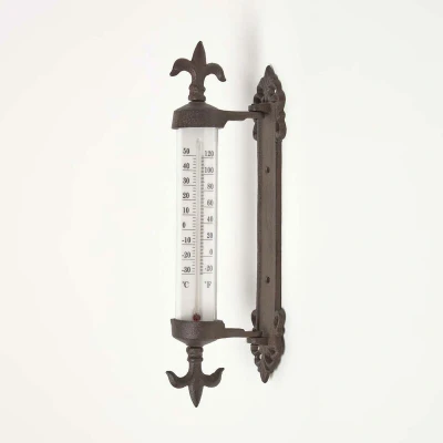 General description This traditional cast iron wall thermometer is perfect for outdoor use, adding a vintage touch to your garden, shed, or greenhouse. With its elegant design, it is an ideal gift for avid gardeners or vintage enthusiasts. Technical specifications Brand: Homescapes Size: L 9.4 x W 5.5 x H 29.5 cm Colour: Brown Material: Cast iron, PE, PS, kerosene Temperature range: -30°C to +50°C (-20°F to +120°F) Installation Wall mounted thermometer; wall fixings not included. Usage Can be used outdoors, including in sheds and greenhouses. Temperature can be read in both degrees Celsius and Fahrenheit. The thermometer is on hinges, allowing you to turn it in any direction. Other information Part of the Homescapes cast iron home accessories range. Complementing items available include door knockers, coat hooks, garden ornaments, and more.