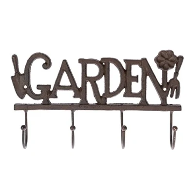 Homescapes cast iron traditional style garden hooks with the word 'Garden' and floral decoration. Measuring 30cm x 18cm x 5.5cm. Manufactured from cast iron, these brown wall mounted hooks feature 4 hooks hanging from a decorative 'GARDEN' sign, ideal for garden accessories and tools. Designed to be installed onto the outside of your property or inside a shed or greenhouse. Requires installation. Easy to clean, simply wipe away any dirt. Homescapes outdoor wall hooks are designed to withstand all weathers. Part of Homescapes’ range of accessories for the home and garden, various cast iron accessory hooks, birdbaths and door bells also available.