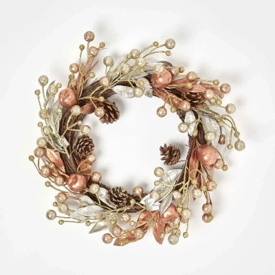 General description This beautiful champagne and gold Christmas wreath is a modern take on a traditional design. Measuring 45 cm in diameter, it features an array of pinecones, apples, and berries, all adorned with a shimmering metallic finish. Perfect for indoor and front door decoration, this decorative accessory will add a festive touch to your home this winter. Technical specifications Brand: Homescapes Size: 45 cm Colour: Champagne Material: Wood, Plastic & Wire Care Instructions Dust lightly with a dry cloth Other information Co-ordinating swags and Christmas garlands are available in the champagne collection. We recommend hanging your wreath in a sheltered area; fixtures and fittings are not included.