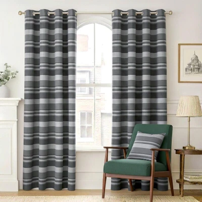HOMESCAPES Charcoal Grey Eyelet Curtain Pair 167cm (66") Wide x 228cm (90") Drop Morocco Stripe Design Ring Top