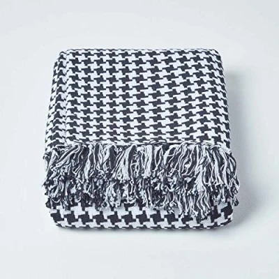 Brand Homescapes Size Available 150cm x 200cm (59" x 79"), 225cm x 255cm (89" x 100"), 255cm x 360cm (100" x 142") Colour Black Material 100% cotton Care Instructions Machine washable Pack Includes One throw Homescapes Black Houndstooth 100% Cotton Bedspread Throw makes a lasting effect with its brilliant check pattern. Crafted using a traditional hand loom in India, these covers are of the highest quality and are constructed using 100% soft cotton yarns. This means that the fabric bears a wonderful balance, obtained from the weaving of single yarns.The contemporary classic check designed originated in woven wool cloth in the Scottish lowlands, but has consistently proven itself as a stylish print over the years; just like stripes, it will never go out of fashion.