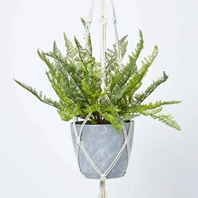 Decorative green fern artificial hanging plant inside a modern style grey pot. Measuring 95 cm in length, 45 cm wide. Pot measures 14.5 cm in diameter. Colour: Green. Carefully handcrafted, each stem and leave is expertly cut from a silk-like polyester and styled to ensure truly lifelike botanical accuracy. UV treated to prevent colour fading hang indoors around your home or outdoors in sheltered and shaded areas. Potted in a contemporary style grey melamine pot, the artificial hanging basket has a long and strong rustic style decorative rope and metal hook for easy hanging. Real hanging plants can take months to grow and require constant maintenance and watering. This replica hanging basket is easy to care for and will look great all year round. Homescapes are one of the UK’s largest retailers of artificial plants, flowers, trees and cactus. Offering a wide selection of plants for every room, interiors style and taste. Why not mix and match to create the perfect look in your home or garden?
