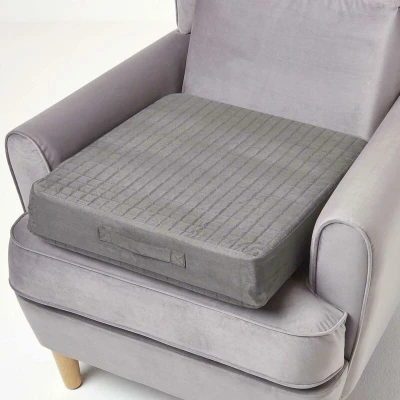 Luxury quilted armchair booster cushion with firm orthopaedic foam for lasting support when sitting. Removable faux suede cover. Measures: 50 x 50 cm square x 10 cm deep (20″ x 20″ x 4″). Colour: Grey. Firm orthopaedic foam (33/190) typically used for chairs and sofas, this durable booster cushion will retain its shape and is designed for regular use, providing lasting support and comfort to the back, knees and hips. Measuring 10cm deep, these extra deep armchair boosters will assists with getting in and out of a chair. Encased within a super-soft faux suede removable cover, this durable cover features a quilted design which is filled with a 170 GSM polyester lining for extra comfort. Featuring a zip closure running down two adjacent sides, it can be easily removed, washed and the foam covered quickly re-inserted. Cover is washable at 40C. Remove foam cushion before washing, ensure cover is completely dried before use. Designed to provide support and comfort to armchairs, booster cushions are ideal for the elderly, pregnant women and those recovering from surgery. Booster cushions are also perfect for rejuvenating old sofas and armchairs that require a seat cushion re-fresh and will retain their shape even with daily use. Available in a range of complimentary colours, it features a handy carry handle for easy transportation. Exclusively designed by Homescapes, this extensive booster cushion collection includes armchair, dining chair and multi-seater cushions available as a complete cushion or with removable cover options, all in co-ordinating colours. Individual armchair booster cushion covers are also available in 100% cotton and soft faux suede in a range of colours.