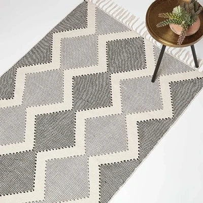 ManoManoGeneral description This HOMESCAPES Malmo Handwoven White & Grey Cotton Textured Rug is a stylish addition to any home. Handwoven from luxury 100% cotton, it features a contemporary chevron pattern in a neutral color palette of grey and white, making it suitable for various interior styles. The rug is designed to enhance your home decor while being functional enough for high footfall areas. Technical specifications Brand: Homescapes Colour: Grey, White Material: 100% Cotton Shape: Rectangle Size: 90 x 150 cm Special Feature: Handwoven pattern with macrame tassels Usage Spot clean only Do not soak Other information Available in two sizes: 90 x 150 cm and 120 x 170 cm For a complete look, pair with matching cushions and pouffes