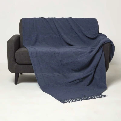 HOMESCAPES Handwoven Navy Blue Throw 255 x 360 cm Textured 100% Cotton Blanket with Tassels Lightweight All Season “Kashi Bed or Sofa