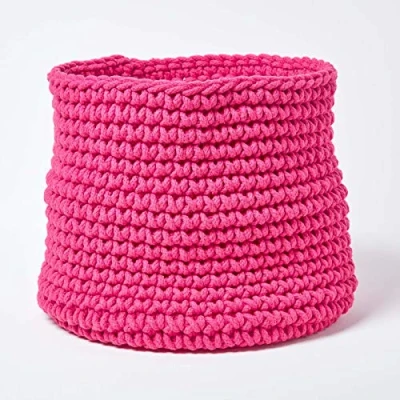 Amazon100% Cotton Hand Knitted Storage Basket W42 x H37cm. Colour: Hot Pink Round and deep storage baskets, handwoven from durable and sturdy cotton ensuring it retains its shape when used. Contemporary storage solution for keeping your rooms clutter-free. Ideal for small items, remote controls and toy storage. Ideal for all the family, use in living rooms, children's bedrooms and playrooms. Part of Homescapes' collection of knitted pouffes, baskets and footstools available in various colours, styles and sizes.