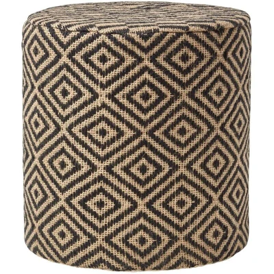 AmazonSturdy pouffe made from 85% Jute and 15% Cotton. With a strong & compressed polystyrene filling and soft padded foam top. Zig-zag stripe in black and natural colourway Eye-catching herringbone weave pattern Can also be used as a table, foot stool or occasional seat Round Shape, Measures 40 x 40 x 42 cm