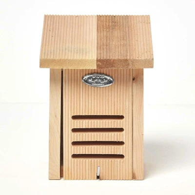 Brand: Homescapes Size: L 15.9 x W 15.5 x H 22 cm Colour: Natural Material: 100% FSC® Alderwood A natural coloured ladybird house, made from responsibly sourced alder wood. This bug hotel has 15mm thick insulated walls, making it an ideal hibernation box. Insect House The natural wood ladybird house is the ideal present for any nature lover. Designed to protect ladybirds against other predators, this bug hotel has been designed to keep the wind and rain out, as well as to be temperature regulated. Complete with ventilation and draining holes, with sides enclosing the floor to keep water out. Bug Hotel The front of this insect house has been hinged, making it easy to open and clean as needed. This also allows you the option to add leaves to the inside, making them feel right at home. Ladybirds often hibernate in groups, so you're likely to find more than one using the wall mounted ladybird house at a time. Wall fixings not included.