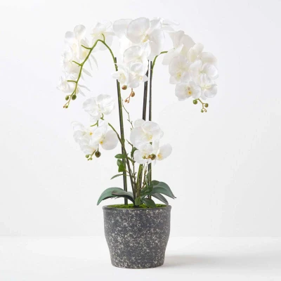 ManoManoGeneral description Brighten up your home or office with the HOMESCAPES White Orchid, a stunning extra-large artificial plant featuring 4 stems. This lifelike Phalaenopsis orchid is expertly handcrafted from high-quality materials, ensuring true botanical accuracy and a realistic feel. Ideal for windowsills, bathrooms, and side tables, it adds a touch of elegance to any dull living space. Technical specifications Brand: Homescapes Plant Height: 82 cm Width: 48 cm Pot Dimensions: Height 19 cm, Width 24 cm Pot Base: 16 cm Material: Silk-like polyester petals, grey ceramic pot Care Instructions Wipe clean with a soft cloth Keep out of direct sunlight Usage This artificial orchid plant requires little to no maintenance, making it perfect for those with busy lives. Simply wipe over with a damp cloth to keep it looking fresh. Other information This orchid is part of an exclusive range of lifelike artificial orchids from the Homescapes collection. Mix and match with other plants and flowers